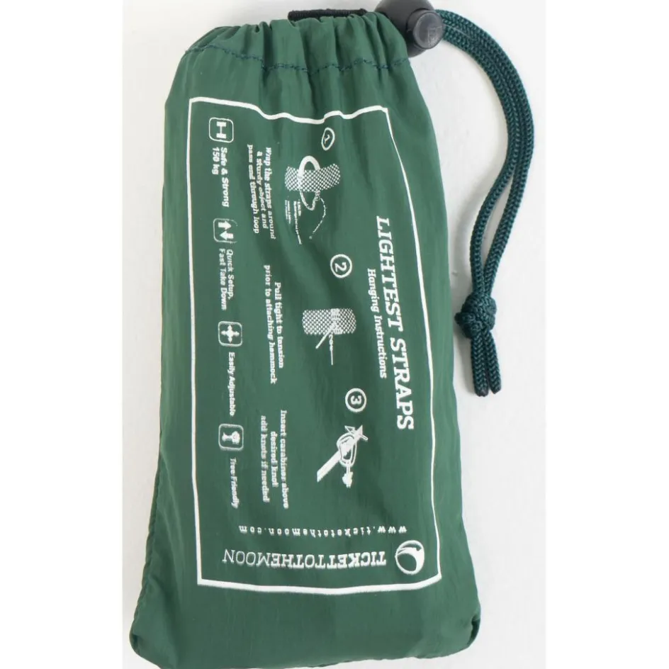 De Ticket to the Moon Lightest straps hangmatbevestiging is heel licht en weegt maar 110 gram. Dit dunne touw is stevig en bestaat uit 2 bevestigingstouwen van 1,6 meter lang. Dit touw kan tot 200 kilogram belast worden.