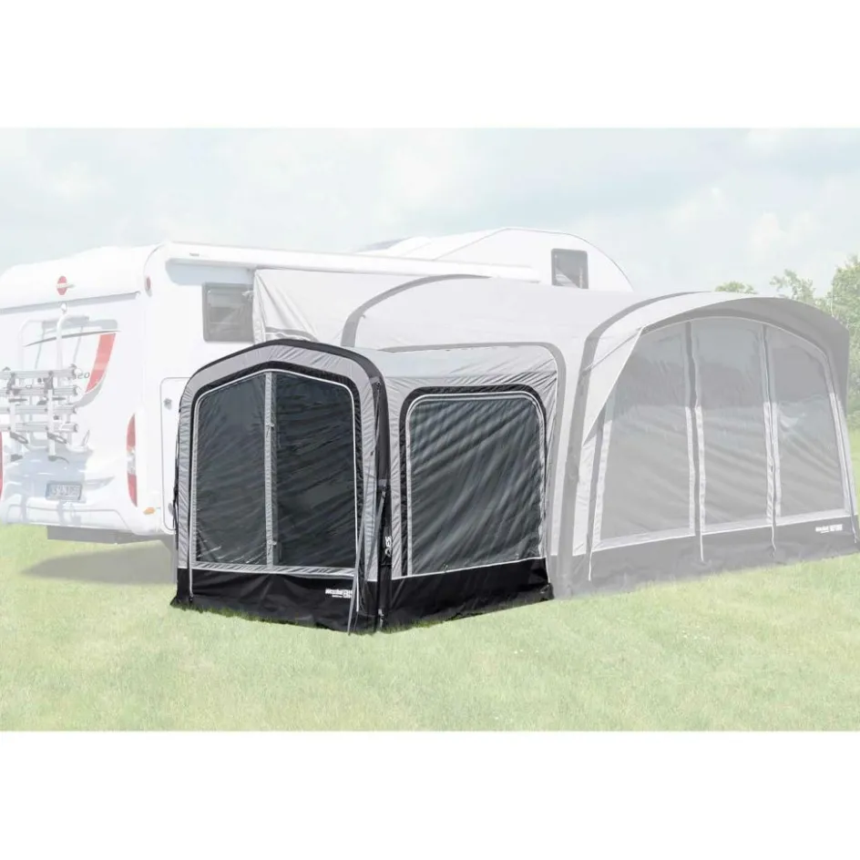 De handige zijwand, afritsbaar en te bevestigen aan de rits van uw voortent, dient als scheidingswand wanneer u de erker wilt afsluiten. Voor ultiem gebruiksgemak zijn alle wanden volledig uitritsbaar. De royale vensters, voorzien van geblindeerde raamfolie, waarborgen privacy en kunnen van binnenuit met een afdekflap volledig bedekt worden. Bovendien kunt u het dak van de Eris eenvoudig op spanning brengen met de meegeleverde aluminium spanstangen.