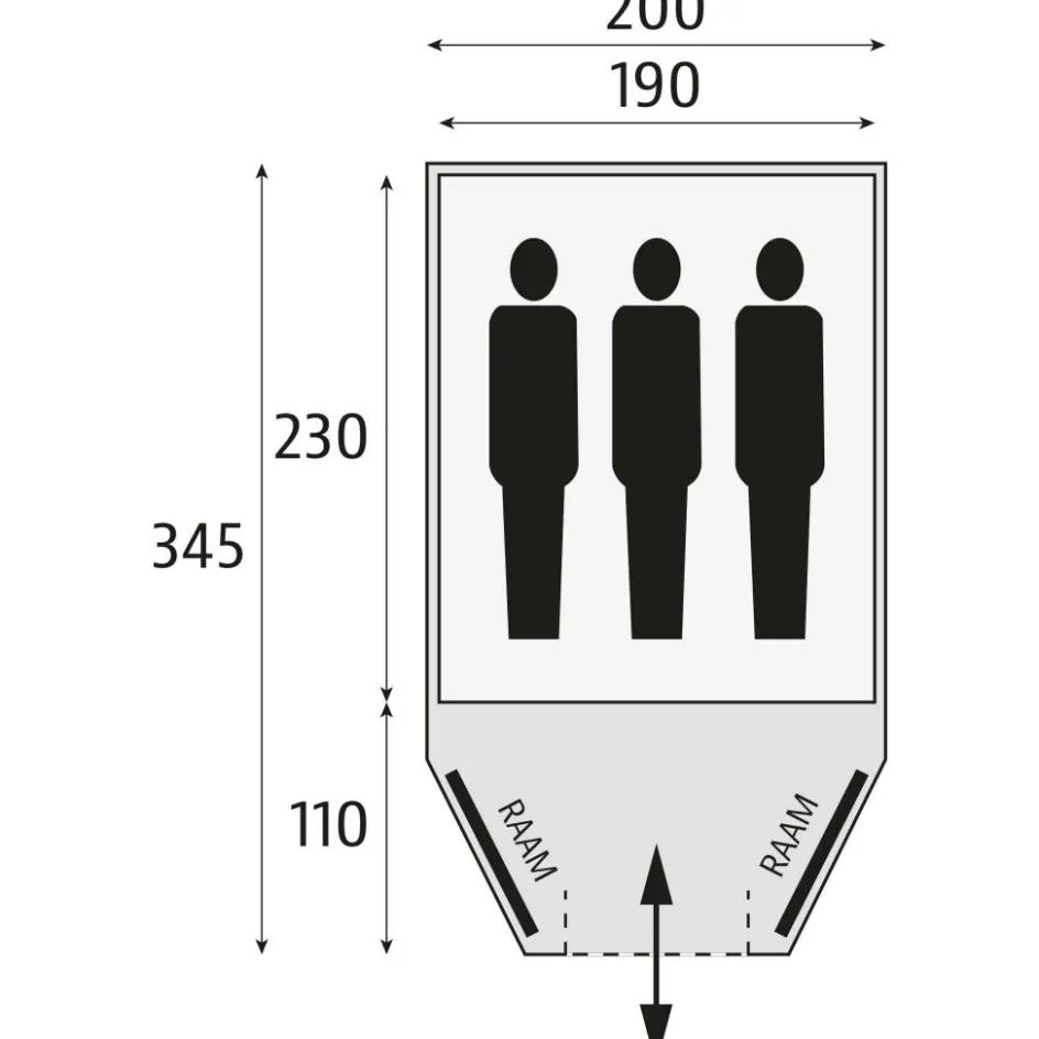 De indeling is simpel en doeltreffend. Achterin bevindt zich één ruime slaapcabine (230 x 190 cm) voor maximaal drie personen. Voor de cabine ligt de voorbouw/leefruimte (110 x 200 cm) met inhaakbaar grondzeil, ideaal om natte spullen te parkeren en uw bagage overzichtelijk te houden. Met 130 cm nokhoogte in het midden en 110 cm aan de voorzijde heeft u voldoende zitruimte zonder dat de tent onnodig wind vangt.