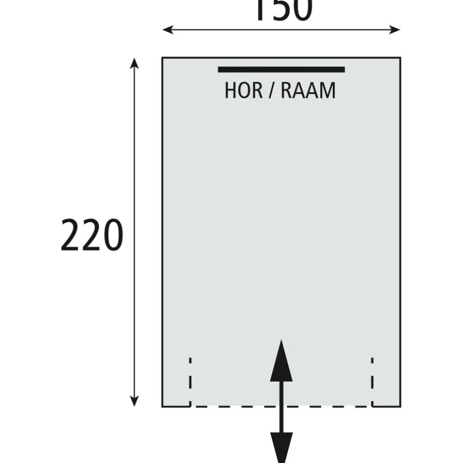 De Faro heeft een overzichtelijke, rechte indeling die elke centimeter benut. Dankzij de lengte van 220 cm plaatst u eenvoudig langwerpige items (zoals een tafel of twee fietsen), terwijl de breedte van 150 cm de tent compact houdt op uw plek. De wandhoogte van 170 cm aan voor- en achterkant maakt de zijkanten goed bruikbaar voor kratten of stapelboxen, en het horraam positioneert u logisch bij vochtgevoelige spullen voor extra ventilatie. Zo creëert u een nette, droge opslagplek naast uw (voor)tent of in de tuin.