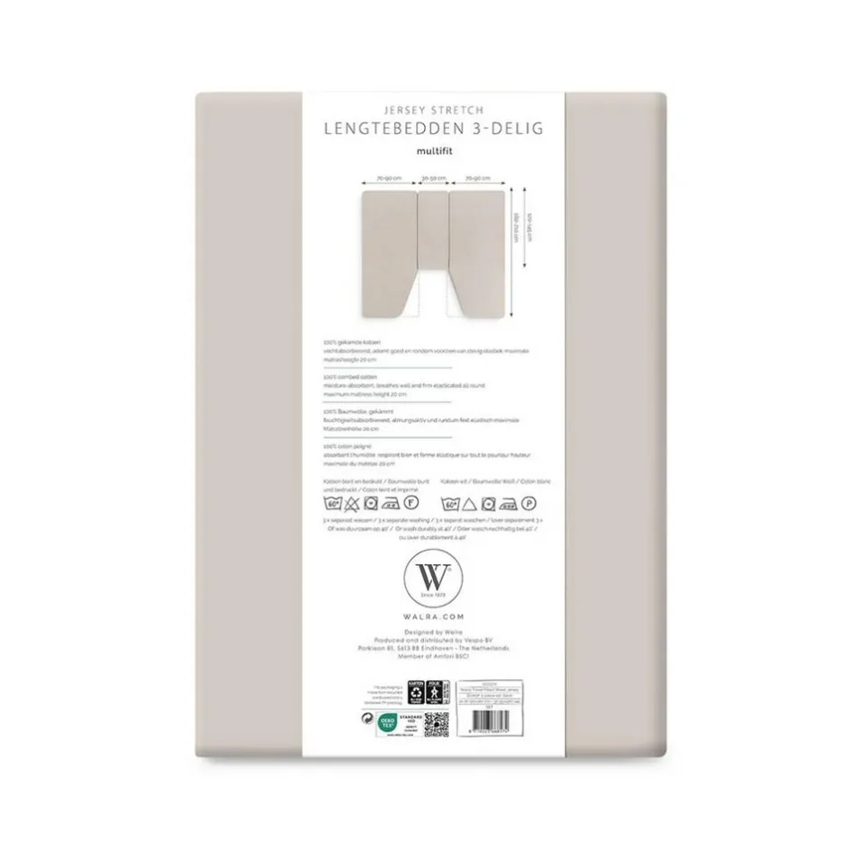 Het Walra Travel Jersey hoeslaken, bestaande uit drie delen, biedt ultiem comfort en een perfecte pasvorm dankzij de Multifit-technologie. Speciaal ontworpen voor een 3-delig bed, is het gemaakt van hoogwaardige 100% gekamd katoen jersey stretch. Dit materiaal combineert zachtheid met duurzaamheid en biedt dankzij de gebreide structuur uitstekende elasticiteit en een luxueus gevoel. De afmetingen zijn praktisch: twee zijstukken van 70-90 x 180-210 cm en een middendeel van 30-50 x 120-145 cm, waardoor het moeiteloos past op verschillende matrassen.