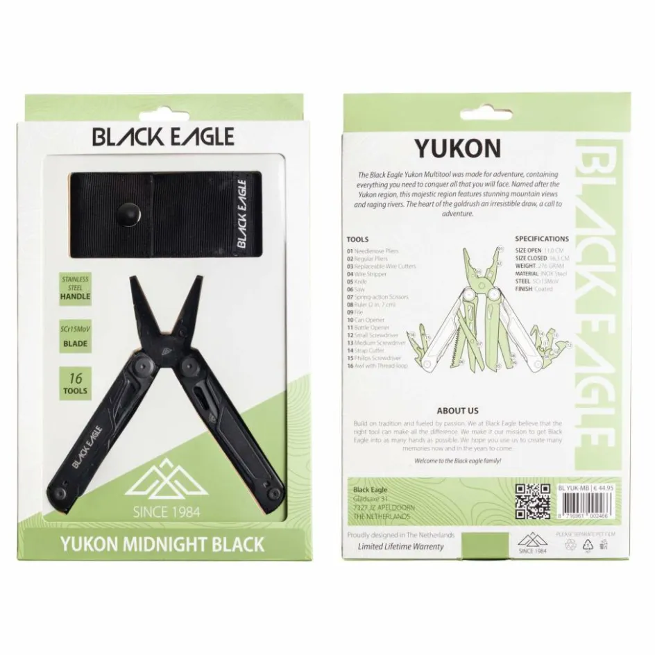 Met de Black Eagle Yukon multitool gaat u goed voorbereid op avontuur. Deze multitool heeft maar liefst 16 functies, waardoor u voor elke uitdaging de juiste oplossing bij de hand heeft. De tool is gemaakt van 5Cr15MoV RVS dat corrosiebestendig, taai en makkelijk te slijpen is. De tool is eenvoudig te openen en er is geen specialistische kennis nodig om hem te gebruiken. Bovendien zijn alle onderdelen, met uitzondering van de tang, vergrendeld voor extra veiligheid tijdens het gebruik.
