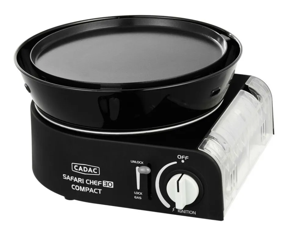 De Cadac Safari Chef 30 Compact is een compacte, lichtgewicht gasbarbecue. Ideaal om tijdens outdoor activiteiten en kampeervakanties te gebruiken. Ondanks zijn kleine formaat is de Safari Chef 30 Compact super veelzijdig en dat allemaal dankzij de verschillende, meegeleverde kookoppervlakken; een pandrager, bakplaat, grillplaat en pan. De bakplaat en het BBQ rooster zijn voorzien van CADAC’s GreenGrill coating. Ze zijn daarom perfect voor het grillen en bakken van vlees, vis en groentes. De Cadac Safari Chef 30 Compact barbecue heeft een lekbak die kookresten opvangt, maar die ook kan dienen als windscherm zodat de brander niet uitwaait. De barbecue werkt namelijk rechtstreeks op een 227 gram gascartridge. De deksel kan ook gebruikt worden als (soep)pan! Een stevige draagtas wordt meegeleverd, zodat u deze gasbarbecue eenvoudig overal mee naartoe neemt.