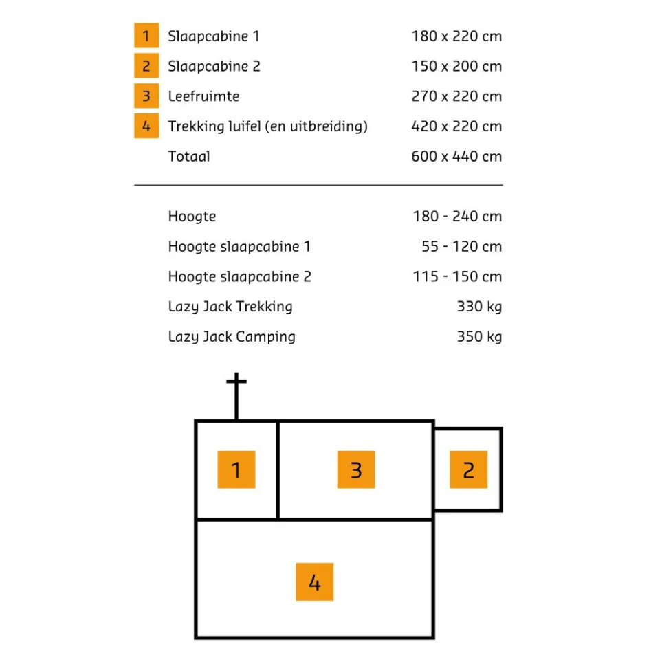 Deze Lazy Jack vouwwagen heeft 2 slaapcabines. De slaapcabine boven de wagen is voorzien van een kingsize matras van 170 bij 210 cm en beschikt over een mooi dakraam en een ladder. Bij de tweede afritsbare slaapcabine ontvangt u twee zelfopblaasbare matrassen. Daarnaast zijn de leefruimte en slaapcabines van deze vouwwagen voorzien van horrengaas en beschikken ze over 3-laagse ramen, waarmee al het ongedierte buiten wordt gehouden. Het tentdoek van deze Lazy Jack vouwwagen is gemaakt van ademend katoen en het frame is gemaakt van roestvrij staal. De vouwwagen beschikt bovendien over een vast kuipzeil van hoogwaardig PVC en 2 openingen met rits voor elektriciteitskabels. Bij deze vouwwagen ontvangt u ook geïntegreerde stormbanden, een reparatie set, haringen en scheerlijnen.