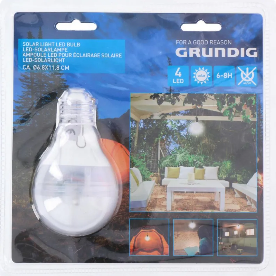 Met de Grundig Solar lamp creëert u een warme sfeer buiten in de tuin of op de camping. Deze lamp heeft een brandtijd van 6 tot 8 uur en laadt overdag op in de zon.
