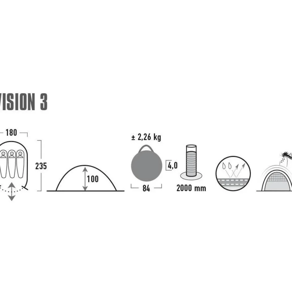 Het buitendoek is van robuust polyester met een waterkolom van 2.000 mm en waterdichte naden. Dat betekent dat de Vision 3 u beschermt tegen regenbuien tijdens een festival of weekendje weg, zonder dat het doek onnodig zwaar wordt. Het vaste polyester grondzeil sluit netjes aan, zodat opspattend water en vuil minder kans krijgen.