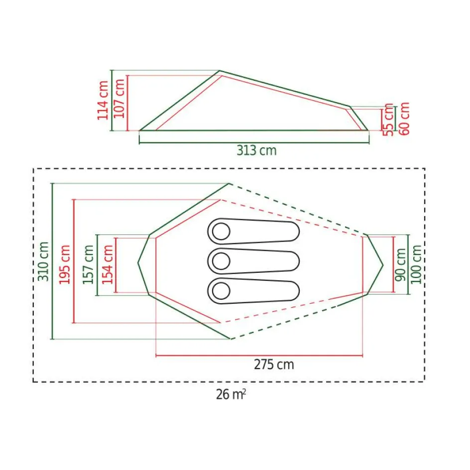 - Totale tentmaat 313 x 310 cm: compacte leefruimte bij de ingang voor tassen en natte schoenen.