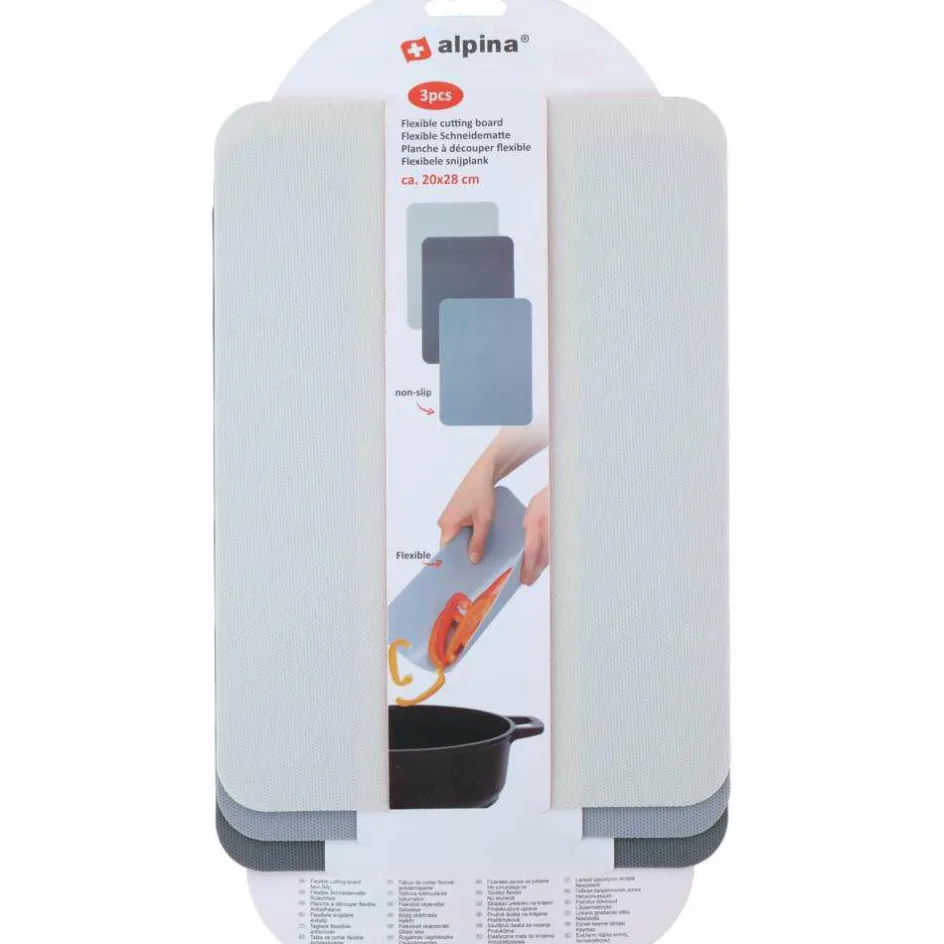 Deze Alpina Flexibele snijplankset bestaat uit drie snijplanken die licht van gewicht en flexibel zijn, erg handig als u de plank wilt vouwen om zo de ingrediënten in de pan te laten vallen. Ook zijn de snijplanken antislip gevoelig zodat u comfortabel uw ingrediënten kunt snijden.