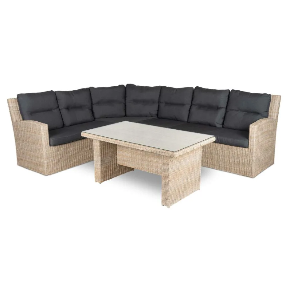 De Bardani Eldorado loungeset is een ruime loungeset gemaakt van stevige en weersbestendige materialen. Er is genoeg ruimte voor 5 à 6 personen. De set bestaat uit een grote hoekbank en een tuintafel. Alle onderdelen hebben een aluminium frame en een afwerking van wicker-vlechtwerk. De set heeft een los tussenstuk waardoor de lange zijde van de bank zowel links als rechts geplaatst kan worden. De hoekbank is voorzien van comfortabele zit- en rugkussens. De tafel heeft een glazen tafelblad, waardoor het een stijlvolle uitstraling krijgt. De afmetingen van de tafel zijn: 146 x 80 x 67 cm.