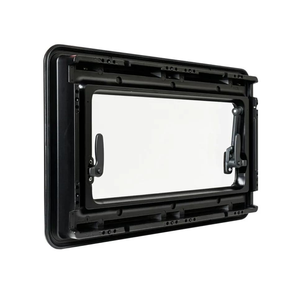 Het raam is geschikt om in te bouwen in campers en caravans met een wanddikte tussen 26 en 41 mm. Dit raam is snel en eenvoudig te monteren en gaat lang mee. Het binnen- en buitenframe zijn aan elkaar geschroefd waardoor deze aan de voertuigwand zijn geklemd. Hierdoor vormt het frame een langdurige en houdbare dichting. Het raam is grijs getint en gemaakt van acryl.