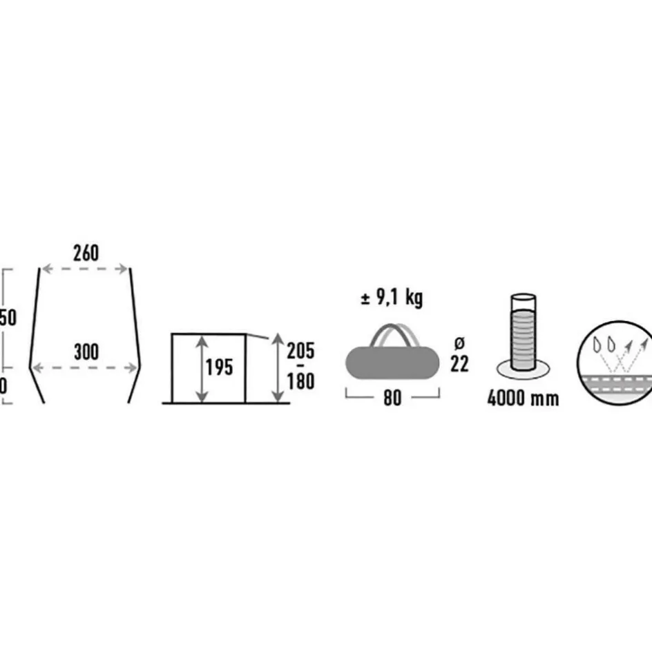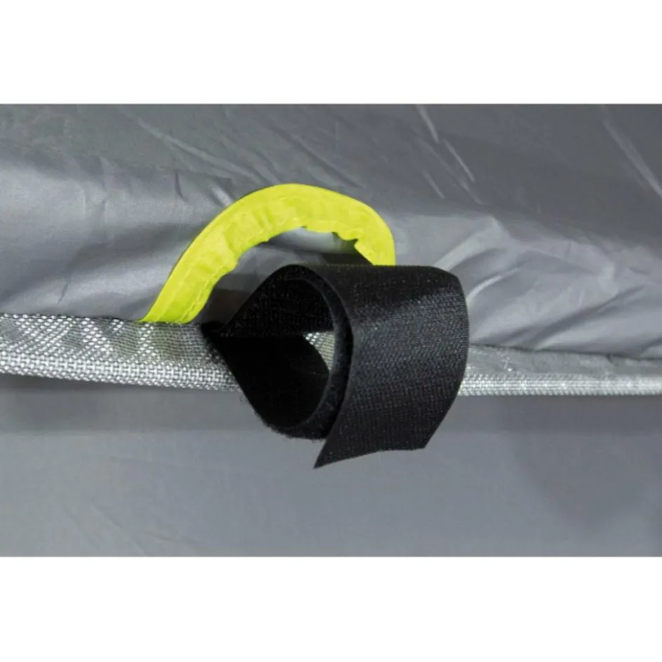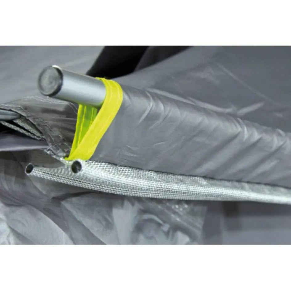 Het buitendoek is gemaakt van stevig polyester met een waterkolom van 4.000 mm, waardoor de leefruimte ook bij langdurige regen droog blijft. De neongele scheerlijnen en meegeleverde stormbanden vallen direct op in de schemering en verhogen de veiligheid rondom de tent.