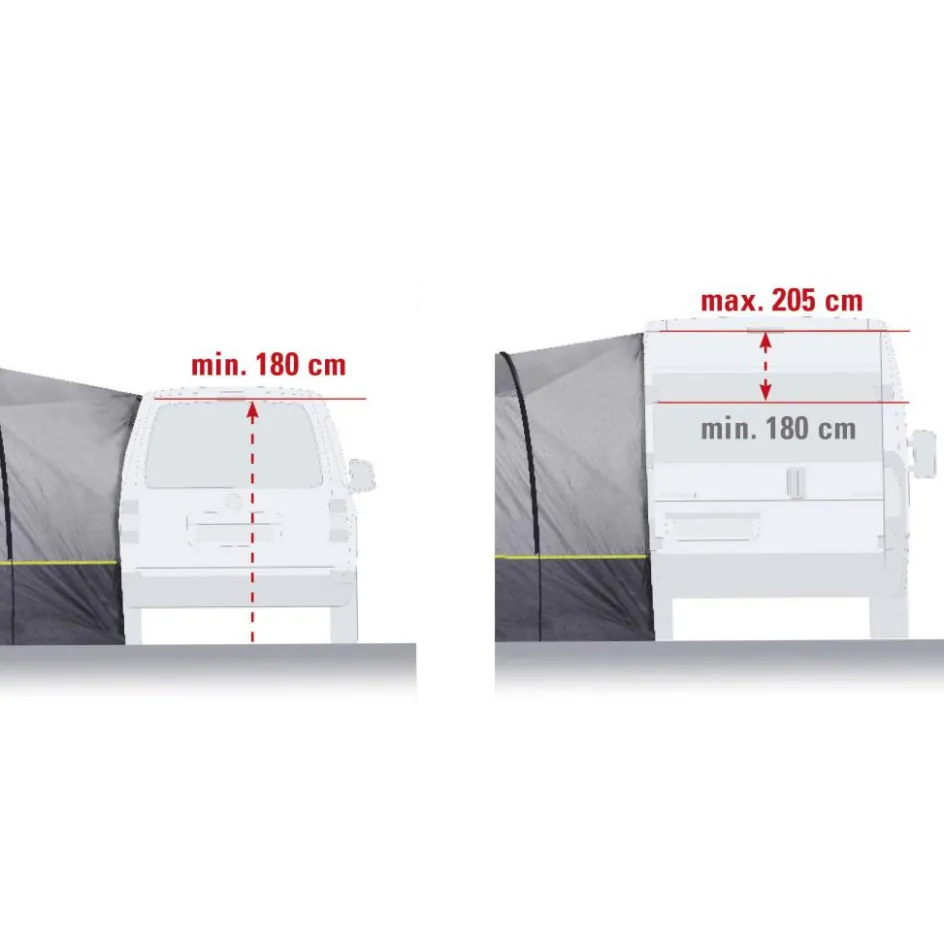- Aansluistunnel naar het voertuig (bevestigingshoogte 180 – 205 cm): afsluitbaar en netjes te spannen voor een tochtvrije verbinding.