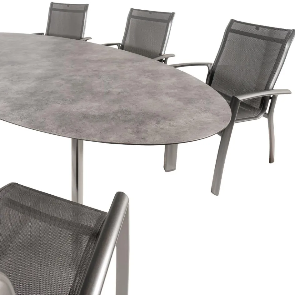 De Kettler HPL Edge 240 Legato tuinset combineert stijl en functionaliteit, bestaande uit een ovale dining tuintafel en zes stapelbare Legato tuinstoelen. De tuintafel is vervaardigd van High Pressure Laminate, wat het blad onderhoudsvriendelijk, weer- en temperatuurbestendig maakt. Het aluminium onderstel met poedercoating en driehoekige tafelpoten, inclusief verstelbare tafelpoot, biedt uitstekende stabiliteit. Roestvrijstalen schroefmateriaal verhoogt de duurzaamheid. De lichte Legato tuinstoelen zijn gemaakt van aluminium met een textileen zitting en rugleuning. Deze stoelen zijn weer- en UV-bestendig, onderhoudsvriendelijk, en kunnen gemakkelijk gestapeld worden. De Legato tuinstoelen zijn ideaal voor langdurig buitengebruik en zorgen voor comfort en gemak in uw tuin.