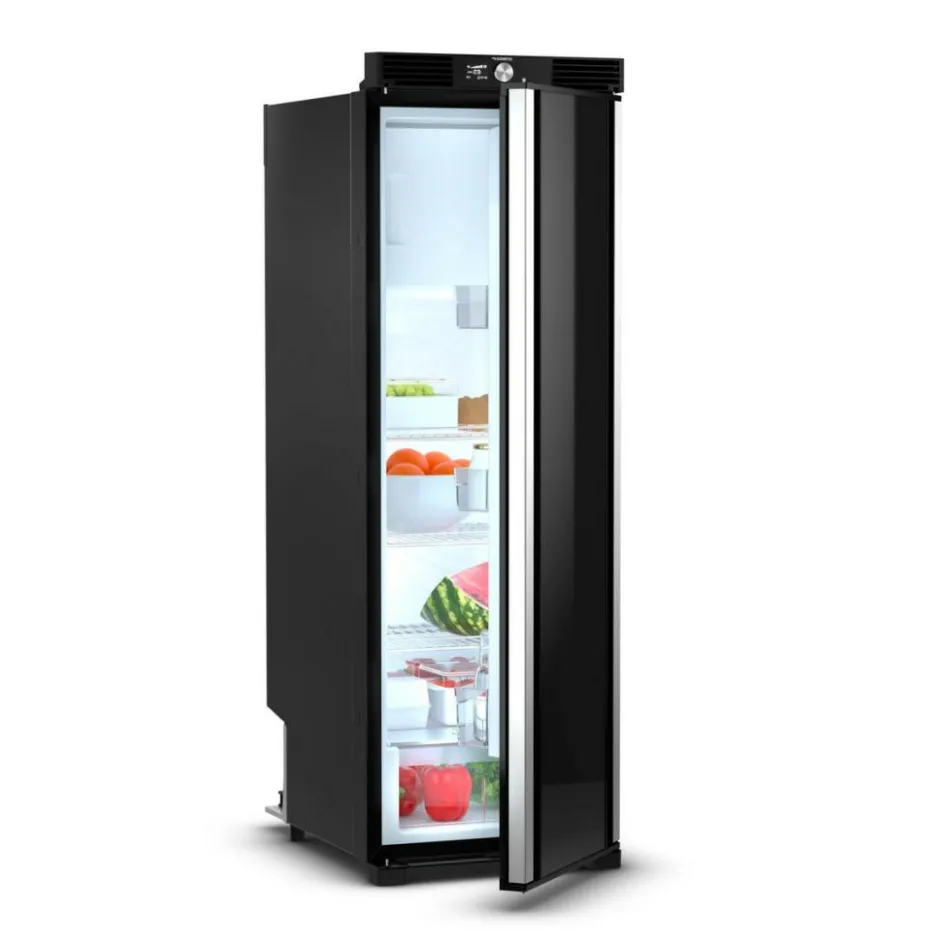 De Dometic RCL10.4ET 157L compressorkoelkast combineert elegantie met functionaliteit. Deze slanke koelkast heeft een uniek dubbel scharnierende deur die zowel links- als rechtsom opent, en een veelzijdig interieur met een uitneembaar vriesvak dat eveneens dubbel scharniert. Een slimme groentelade houdt groenten en fruit langer vers. De aluminium deurgrepen over de volledige hoogte zorgen voor een stijlvolle uitstraling. Dankzij het interne ventilatiesysteem zijn extra ventilatieroosters overbodig. De koelkast is eenvoudig te bedienen met een intuïtief TFT-kleurendisplay en een draai-/drukknop.