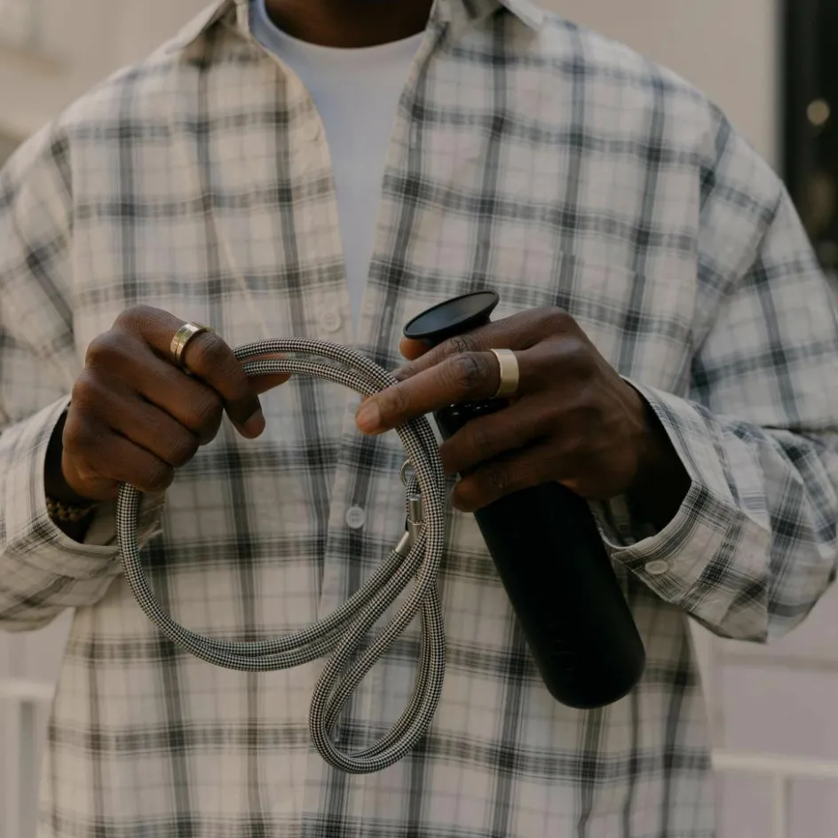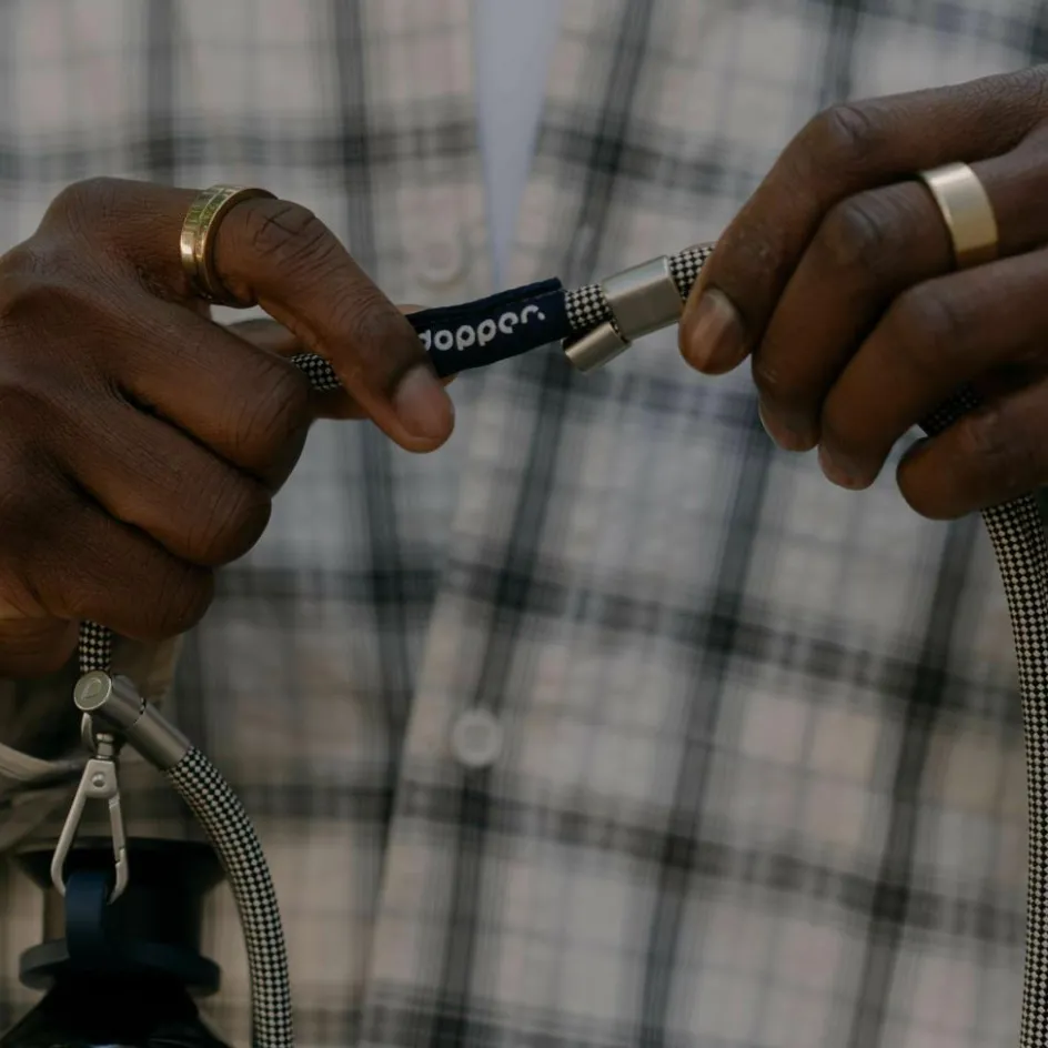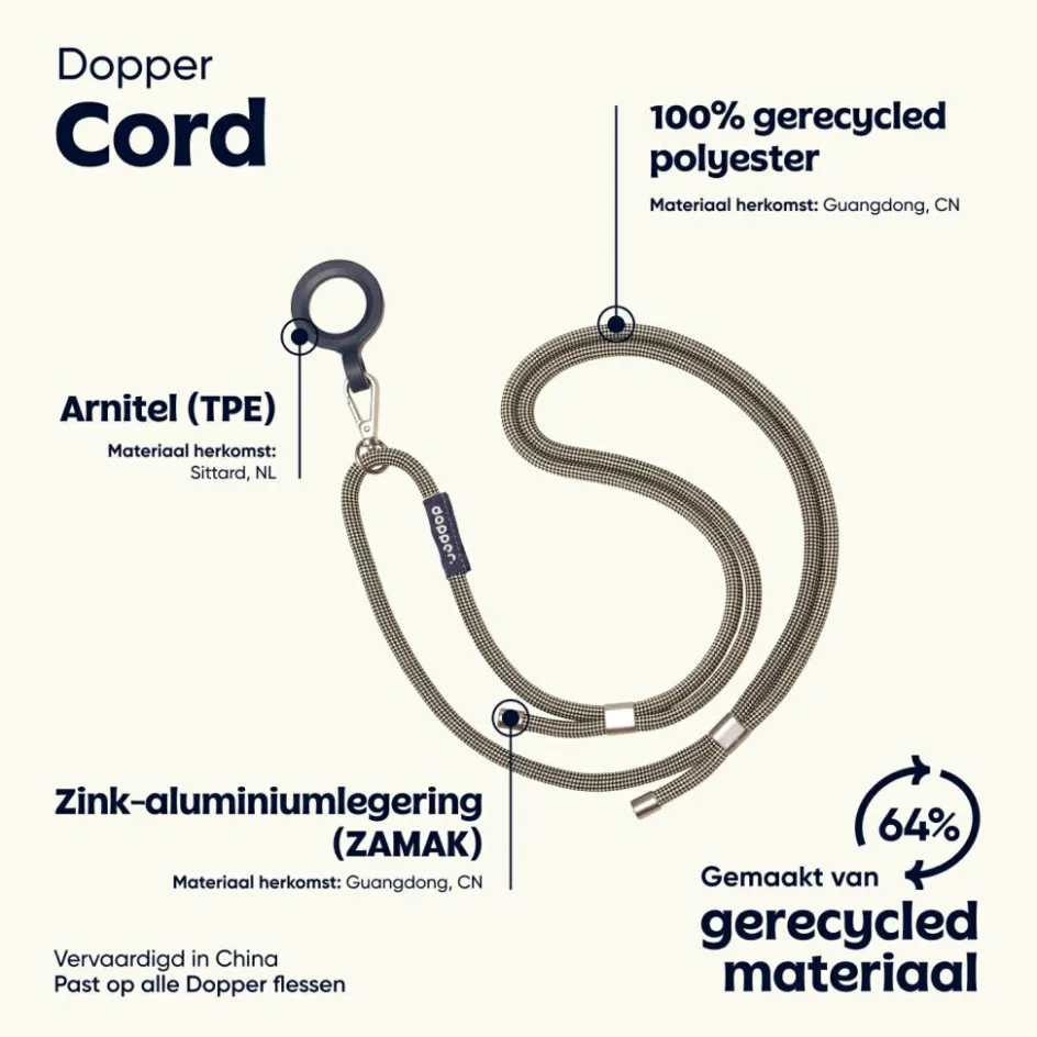 De Dopper Cord is een superhandig koord waarmee u uw drinkfles overal mee naartoe neemt, terwijl u uw handen vrij houdt. De drinkfles is te dragen op diverse manieren, van crossbody tot over de schouders. Dit koord is geschikt voor alle Dopper flessen en is gemaakt van 100% gerecyclede materialen. Bovendien is de ring vaatwasserbestendig tot 65 °C. Het koord is verstelbaar van 45 tot 95 centimeter.