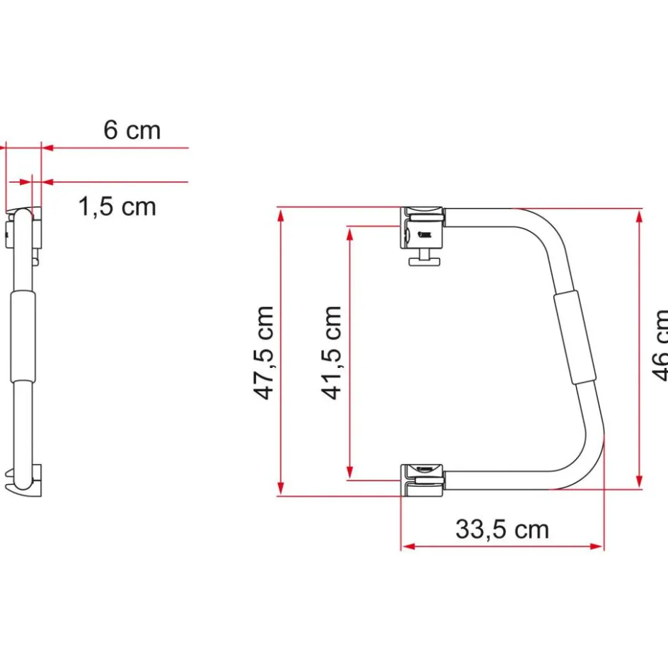 Deze beugel past op alle deuren en kan zowel links als rechts van de deur geplaatst worden. De aluminium veiligheidsbeugel is zeer sterk en mooi wit gelakt. Het handvat op de beugel is zacht en zorgt voor een stevige greep. Hij helpt niet alleen met instappen, maar wanneer de beugel tegen de deur is dichtgeklapt beschermt hij ook tegen inbraak en zorgt hij ervoor dat de deur niet open gaat tijdens het rijden. De beugel heeft een lengte van 46 centimeter, een diameter van 3 centimeter en een dikte van 0,2 centimeter. Tot slot wordt de beugel geleverd met een slot en sleutel, veiligheidshaak, montagebeugels en bevestigingsmateriaal.