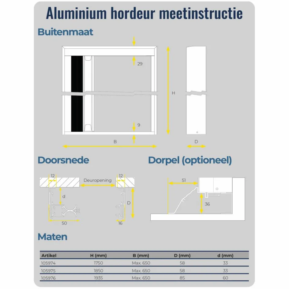 LET OP: Voor het inbouwen van deze hordeur dient u minimaal 30 millimeter in de diepte vrije ruimte te houden tussen uw keukenmeubel en de schuifdeur. Het is namelijk belangrijk dat de schuifdeur gemakkelijk kan schuiven zonder iets aan te raken, zodat er geen problemen kunnen ontstaan tijdens het openen en sluiten van de hordeur.