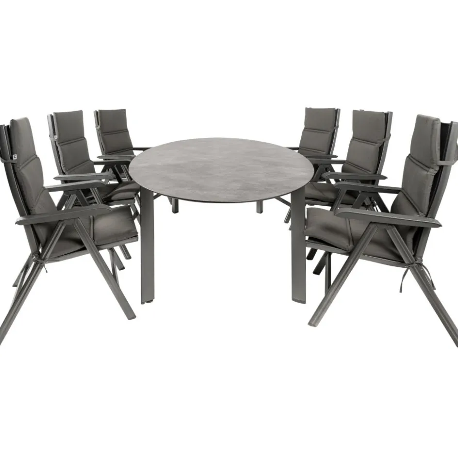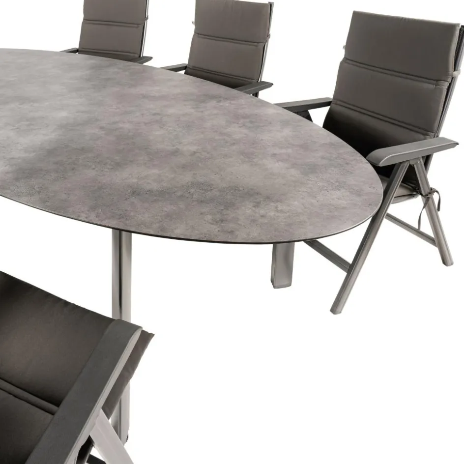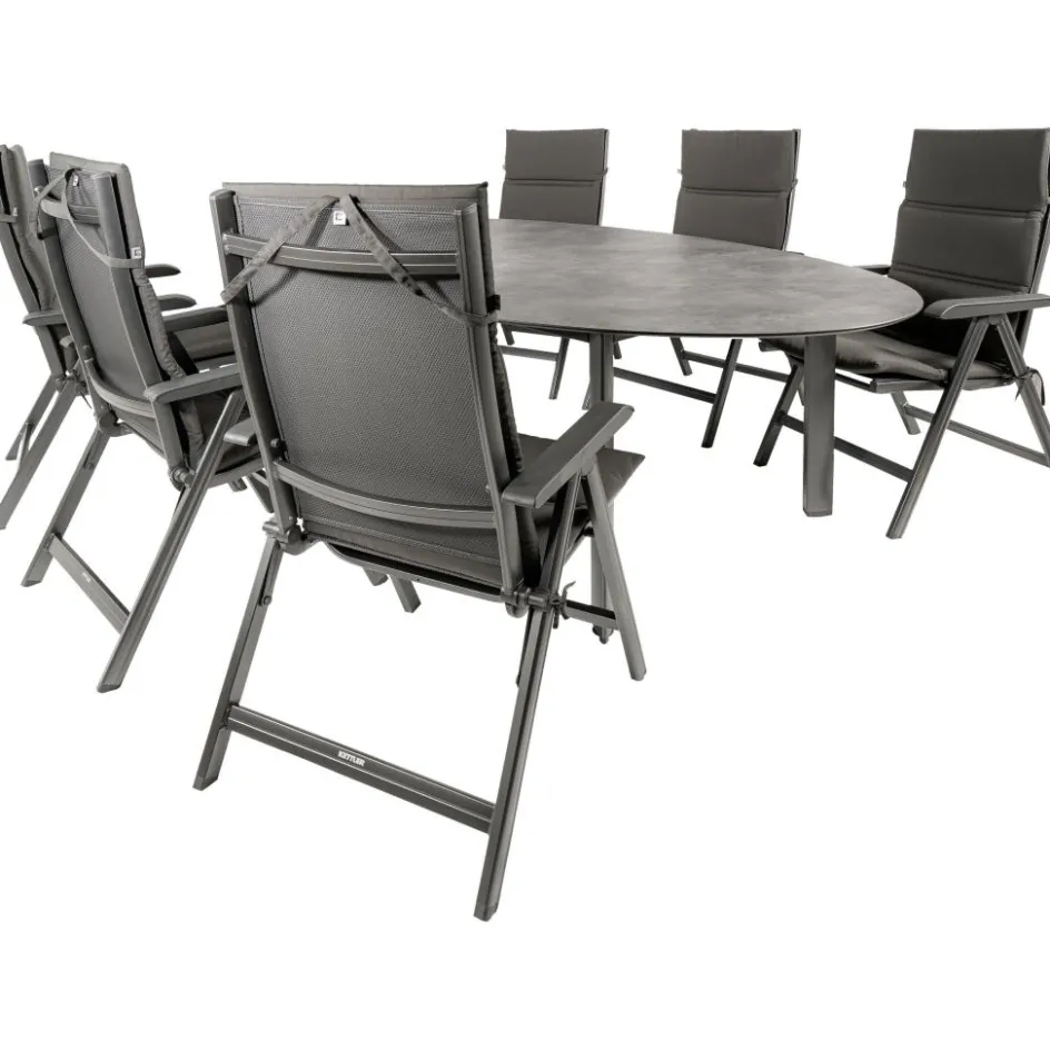 De Kettler HPL Edge 240 Basic Plus tuinset biedt de perfecte combinatie van stijl en functionaliteit voor uw buitenruimte. Deze set bestaat uit een ovale dining tuintafel en zes verstelbare Basic Plus tuinstoelen. De Kettler HPL Edge tuintafel is vervaardigd van duurzaam High Pressure Laminate, wat zorgt voor een onderhoudsvriendelijk, weer- en temperatuurbestendig tafelblad. Het aluminium onderstel met poedercoating en driehoekige tafelpoten, inclusief verstelbare tafelpoot, garandeert stabiliteit en duurzaamheid. De Basic Plus tuinstoelen, uitgevoerd in antraciet, hebben een verstelbare rugleuning en kunnen een maximale belasting van 120 kilogram aan. Deze opklapbare stoelen zijn bestand tegen diverse weersinvloeden dankzij het gebruik van aluminium en textileen, en worden geleverd met comfortabele polyester kussens voor extra zitcomfort.