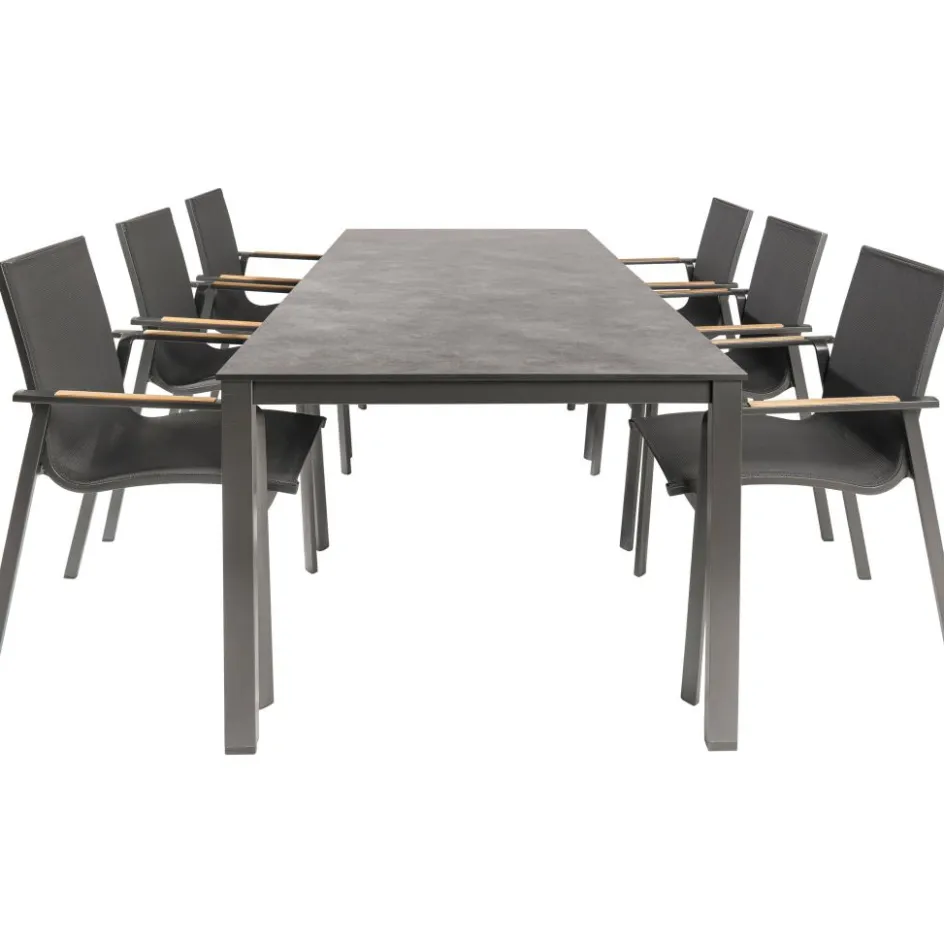 De Kettler HPL 220 Diamond 6 dining tuinset bestaat uit een tuintafel en zes stapelbare Diamond tuinstoelen. De tuintafel, vervaardigd van High Pressure Laminate (HPL), biedt uitstekende duurzaamheid en onderhoudsgemak, ideaal voor permanent buitengebruik. Het aluminium Cubic onderstel combineert een tijdloos, modern ontwerp met een lichtgewicht constructie, bestand tegen diverse weersomstandigheden en UV-straling, wat langdurige kwaliteit garandeert. De Kettler Diamond tuinstoelen zijn compact en lichtgewicht, met een minimalistisch design en stijlvolle teak houten leuningen. Gemaakt van weerbestendige materialen, zijn deze stoelen een duurzame optie voor in de tuin.