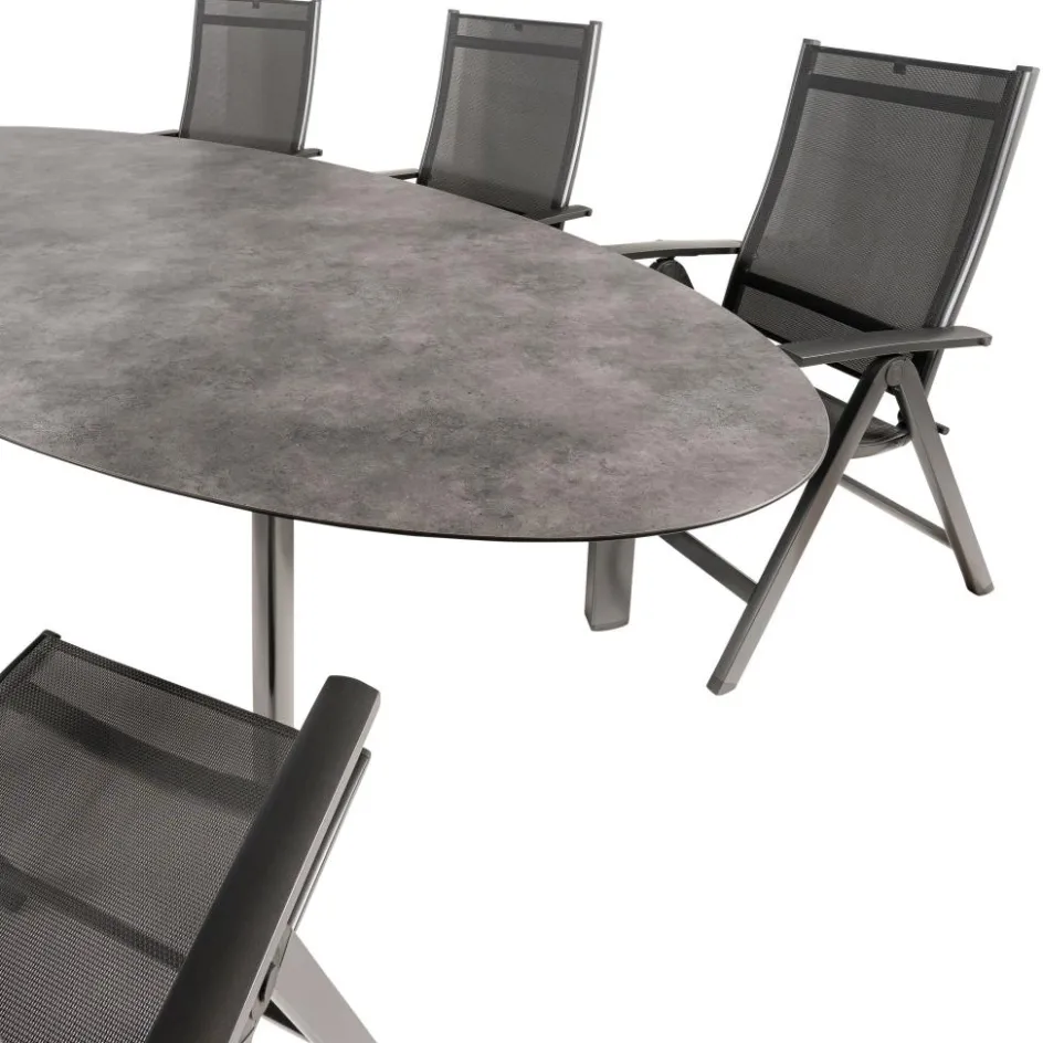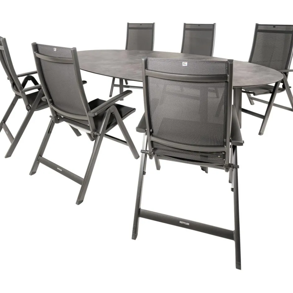 De Kettler HPL Edge 240 Easy 6 verstelbaar tuinset bestaat uit een HPL Edge tuintafel en zes verstelbare Easy tuinstoelen. De ovale HPL Edge tuintafel brengt stijl in uw tuin met een tafelblad van High Pressure Laminate, perfect voor buitengebruik dankzij de onderhoudsvriendelijkheid en weer- en temperatuurbestendigheid. Het aluminium onderstel heeft een poedercoating en driehoekige poten, met een verstelbare tafelpoot voor een waterpas stand. Roestvrijstalen schroefmateriaal zorgt voor hoge stabiliteit en duurzaamheid. De Kettler Easy verstelbare tuinstoelen hebben een 4-voudig verstelbare rugleuning voor ultiem comfort. Gemaakt van weerbestendige, onderhoudsvriendelijke materialen, hebben ze een strak aluminium frame en een zitting en rugleuning van stevig textileen.