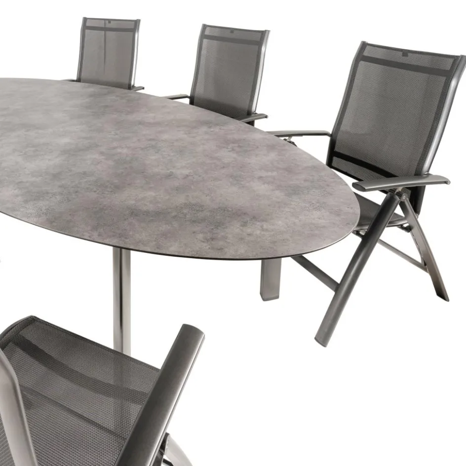 De Kettler HPL Edge 240 Legato tuinset biedt een stijlvolle en duurzame oplossing voor uw buitenruimte. Deze set bestaat uit een ovale dining tuintafel en zes verstelbare Legato tuinstoelen. De tuintafel is vervaardigd van High Pressure Laminate, wat het blad onderhoudsvriendelijk en weer- en temperatuurbestendig maakt. Het aluminium onderstel met poedercoating en driehoekige tafelpoten, inclusief verstelbare tafelpoot, zorgt voor stabiliteit en duurzaamheid. De Legato Curve verstelbare tuinstoelen zijn comfortabel en veelzijdig, met vier verstelbare posities. Gemaakt van een aluminium frame en textileen zitting en rugleuning, zijn deze stoelen weerbestendig en eenvoudig te onderhouden. Deze tuinset combineert functionaliteit en comfort, perfect voor ontspannen buiten dineren.