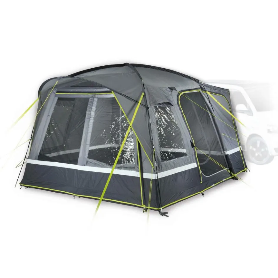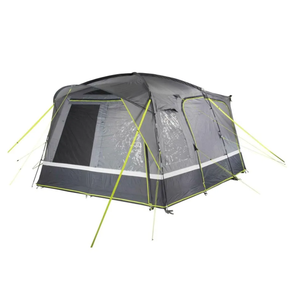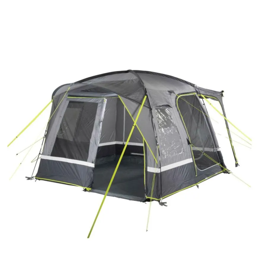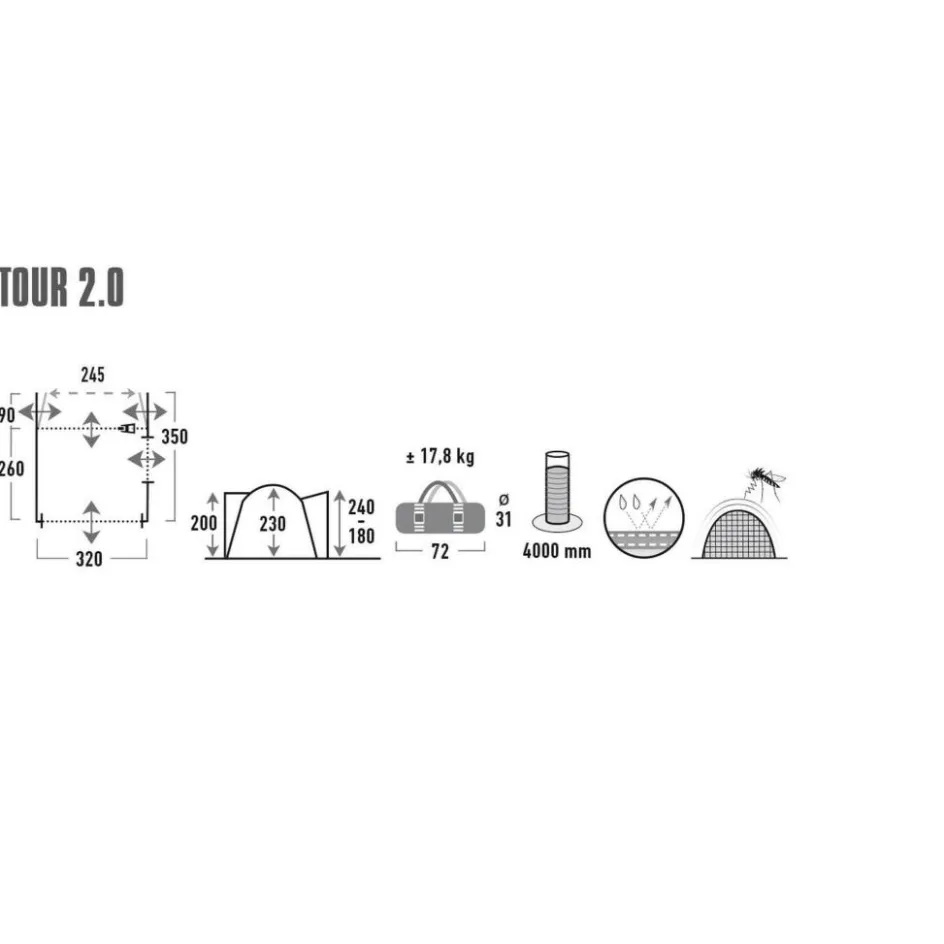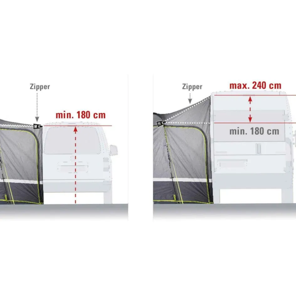 De High Peak Tour 2.0 is een praktische drive-away bustent die uw bus of camper direct extra leefruimte geeft. Met een aansluithoogte van 180 – 240 cm koppelt u hem aan de meeste buscampers en hogere auto’s. Met een waterdicht buitendoek tot 4.000 mm blijft u ook bij stevige buien comfortabel droog. De voorgebogen boogconstructie met gebogen dak zorgt voor prettige stahoogte, terwijl het vastgestikte grondzeil met modderflap tocht, vuil en insecten buiten houdt. Zoekt u een flexibele, vrijstaande aanbouw die meereist met uw plannen? Dan is de High Peak Tour 2.0 een solide keuze.