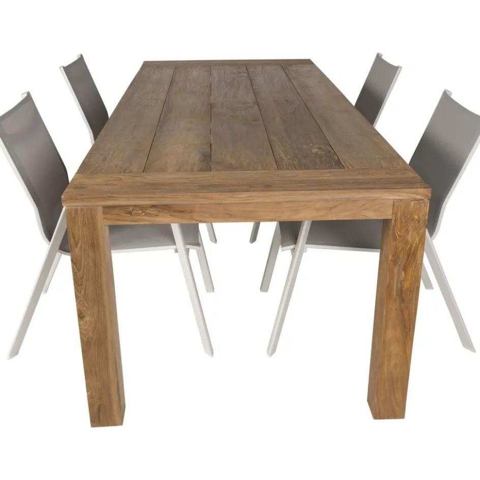 De Bardani Roma 240 Aruba 4 tuinset is geschikt voor vier personen. Deze Bardani tuinset bestaat uit vier Aruba dining stoelen en de Roma tuintafel van Bardani. Ondanks zijn lengte van 240 centimeter is deze tafel door het gebruik van teakhout uiterst stevig en stabiel. De poten en blad zijn beide volledig massief afgewerkt. Teakhout staat er bekend om dat het zeer duurzaam is. Het is niet gevoelig voor rot en bestand tegen vele weersomstandigheden. De minimalistisch vormgegeven Aruba dining stoelen zijn ook weerbestendig door het gebruik van aluminium en textileen. De stoelen zijn tevens ook stapelbaar, ze nemen dus weinig plaats in als ze opgeborgen moeten worden.