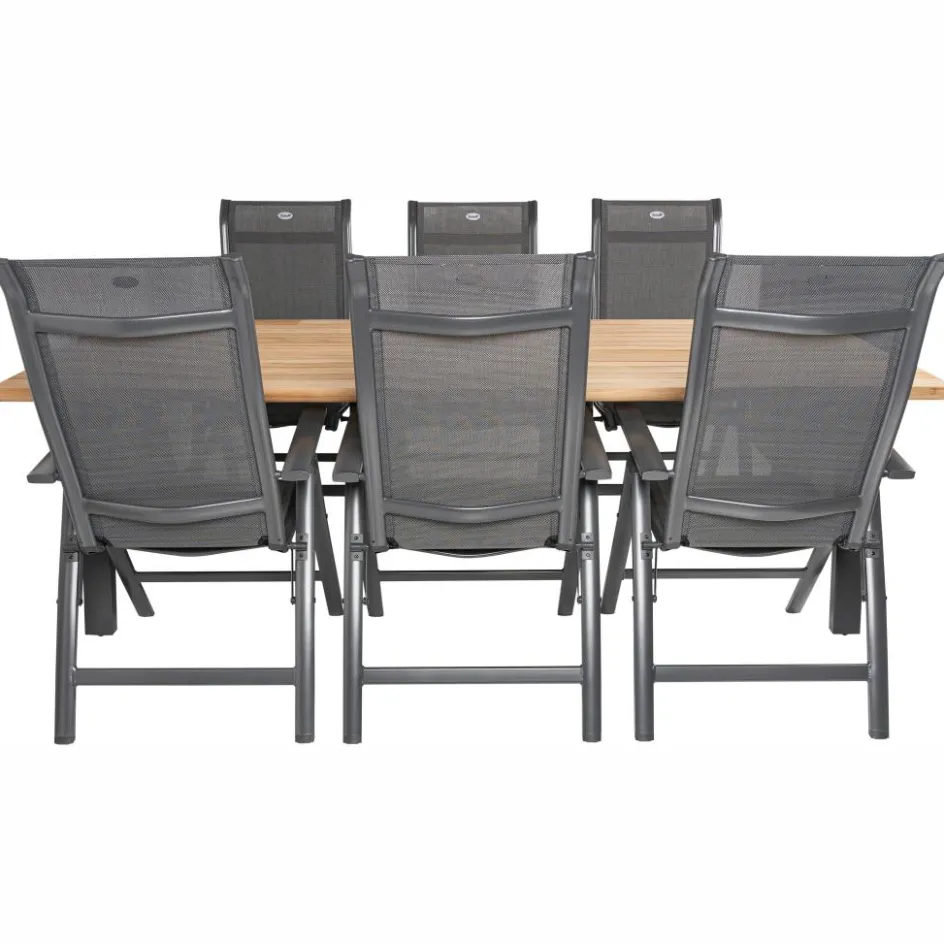 De Taste by 4 Seasons Ambassador 240 x 100 cm Alice 6 tuinset is een comfortabele en weerbestendige tuinset die bestaat uit een robuuste tafel met een teakhouten tafelblad en 6 verstelbare stoelen met een comfortabele zitting, gemaakt van lichtgewicht aluminium. Hierdoor is de tuinset van Taste by 4 Seasons onderhoudsarm en kan deze gewoon het hele jaar buiten blijven staan.