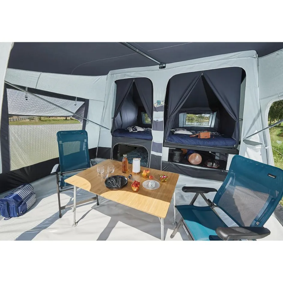 Deze ruime vouwwagen van Jamet is maar liefst 400 bij 495 cm en beschikt over een grote voortent met 2 verandawanden en 2 slaapcabines. De slaapcabines zijn donkerder gemaakt voor meer slaapcomfort en de bedden hebben 2-persoons lattenbodems met stevige schuimmatrassen. Het rechter bed is opklapbaar, waardoor er meer bergruimte vrijkomt. Daarnaast heeft deze vouwwagen een mooie ECO-boogluifel met zijwanden met grote ramen. Deze ramen hebben flappen die opgerold en vastgezet kunnen worden met gespen. Ook zijn deze ramen voorzien van ventilatie.