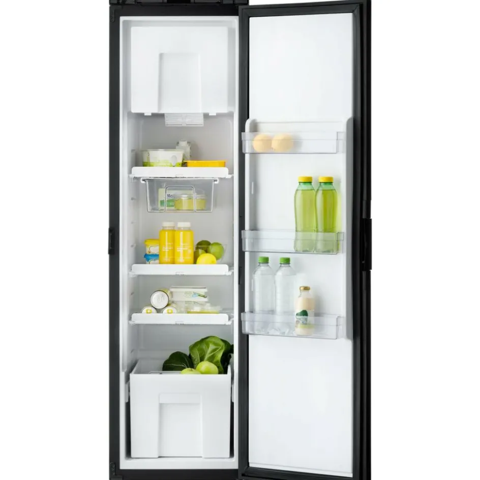 Tijdens het reizen hoeft u zich geen zorgen om omvallende producten te maken. De lades en plankjes zijn zo ontworpen dat het eten goed blijft staan. De koelkast heeft een deurdraaiing naar links en rechts.