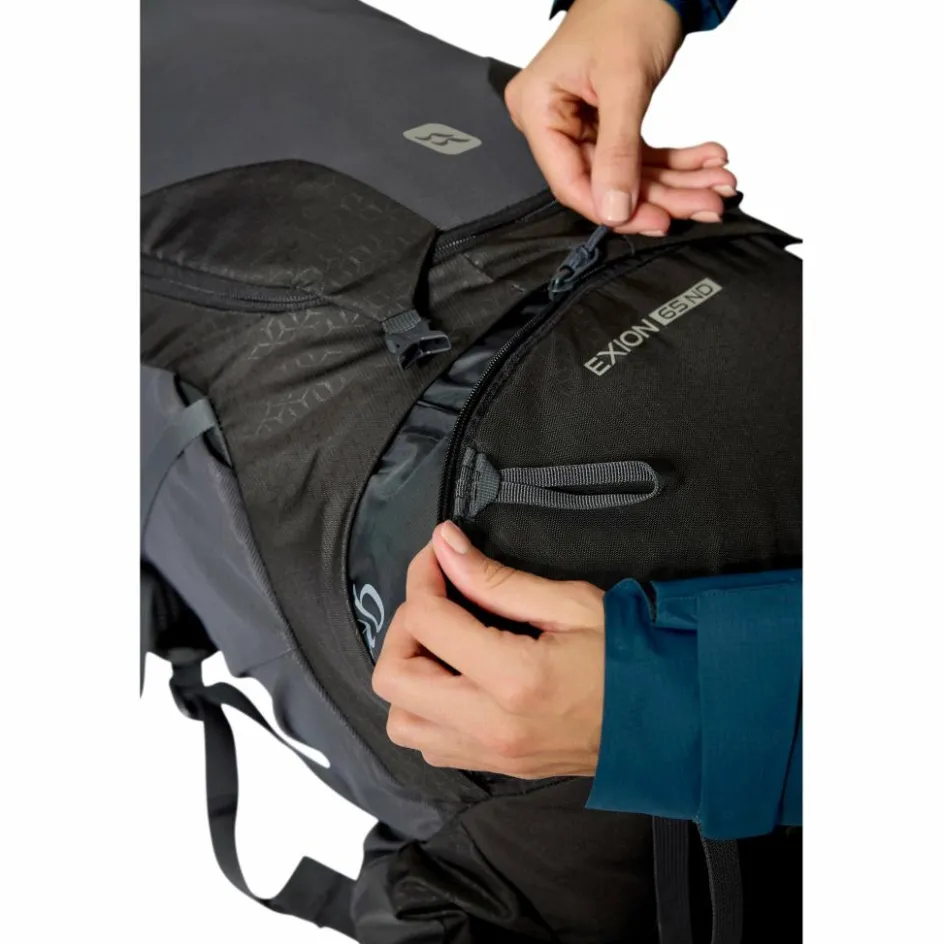De Rab Exion ND backpack van 65 liter voor vrouwen is voorzien van een slim V-TRAX draagsysteem dat volledig contact maakt met de rug. Dit zorgt voor een stabiele pasvorm, goede ondersteuning en maakt het comfortabeler om zware lasten te dragen. Dankzij het smallere ontwerp sluit deze backpack perfect aan op het vrouwenlichaam, wat zorgt voor extra comfort tijdens langere tochten. De tas heeft een praktische indeling met diverse opbergvakken, waaronder een ruim hoofdvak, een bovenvak, een voorvak, zijvakken voor bijvoorbeeld een waterfles en heupvakjes voor kleinere spullen. Ook wordt er een regenhoes meegeleverd, en kunt u uw wandelstokken bevestigen aan de zijkant van de backpack. Deze backpack is geschikt voor personen met een ruglengte van 43 – 48 cm.