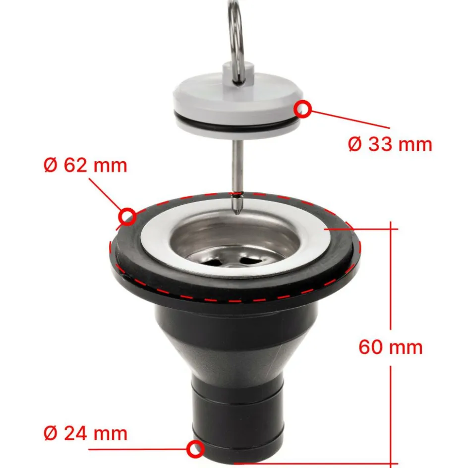 De diameter van de Reich rechte afvoerplug is 63 mm. De afvoerplug stop van dit model heeft een diameter van 33 mm. De diameter van de slangaansluiting is 25 mm.