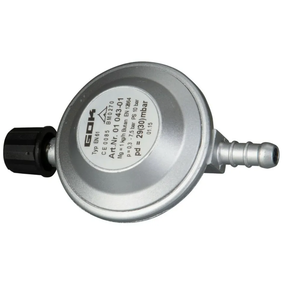 GOK levert de gasdrukregelaar Campingaz 30 mbar met slangpilaar. Sinds 2002 is een Europese norm van kracht waarin staat dat 30 mbar voor gasinstallaties in voertuigen geldt. Daarvoor bestemde gasinstallaties kunnen zowel 30 als 50 mbar zijn. Een drukregelaar koppelt een gasfles aan de gasinstallatie en zorgt voor een constante en juiste druk op de aangesloten apparatuur. De reguliere druk op een gasfles is bij 15°C circa 7 bar, vandaar dat u een gasdrukregelaar nodig heeft.
