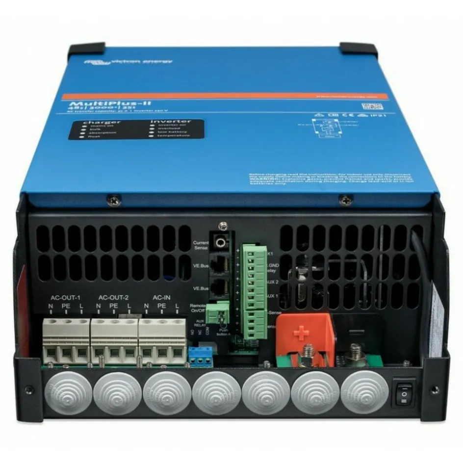 De MultiPlus-II combineert de functies van de MultiPlus en MultiGrid en is voorzien van een geïntegreerde eilandbedrijf-beveiliging. Dankzij de externe stroomsensoroptie is PowerControl en PowerAssist eenvoudig te implementeren, waardoor het eigen verbruik met externe stroomdetectie tot 50A kan worden geoptimaliseerd. Met PowerAssist voorkomt de MultiPlus-II overbelasting van beperkte AC-bronnen, zoals aggregaten of walaansluitingen. Eerst wordt de acculading automatisch verminderd, waarna de accu stroom levert om extra vermogen te ondersteunen. De MultiPlus-II kan moeiteloos worden gecombineerd met MPPT-zonneladers en netgekoppelde PV-omvormers.