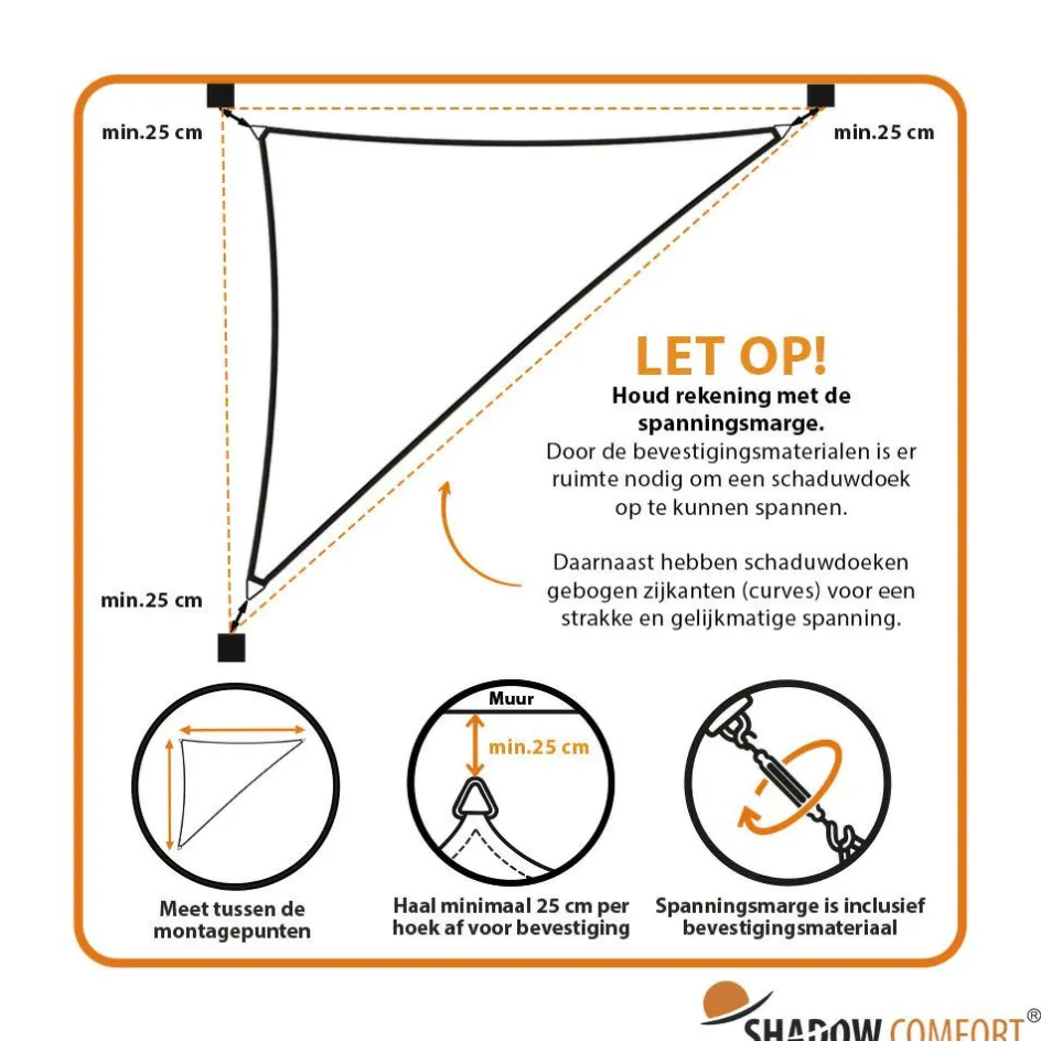 U maakt de perfect schaduwplek in uw achtertuin of op uw balkon met het UV-werende Shadow Comfort Driehoek schaduwdoek. Dit schaduwdoek van Shadow Comfort is luchtdoorlatend en voorkomt regenophoping vanwege de waterdoorlatende textuur. Het HDPE materiaal is daarnaast bestand tegen schimmel en eenvoudig te reinigen. Bovendien is het doek dankzij de RVS-bevestigingsringen snel te monteren en weer los te halen.