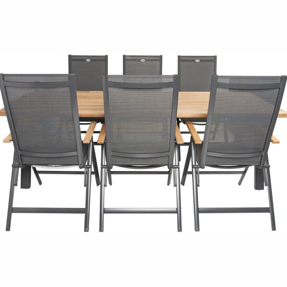 De Taste by 4 Seasons Ambassador 240 x 100 cm Aruba 6 tuinset is een 7-delige set die bestaat uit een robuuste tafel, gemaakt van aluminium en teakhout en 6 verstelbare stoelen gemaakt van textileen en aluminium. Hierdoor is de tuinset onderhoudsarm en heeft deze een lange levensduur. Kortom met een comfortabele Taste by 4 Seasons tuinset creëert u een stijlvolle en gezellige sfeer in uw tuin.