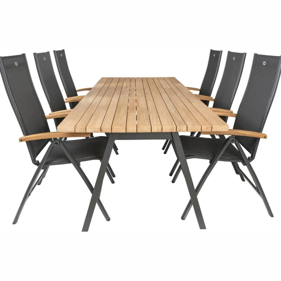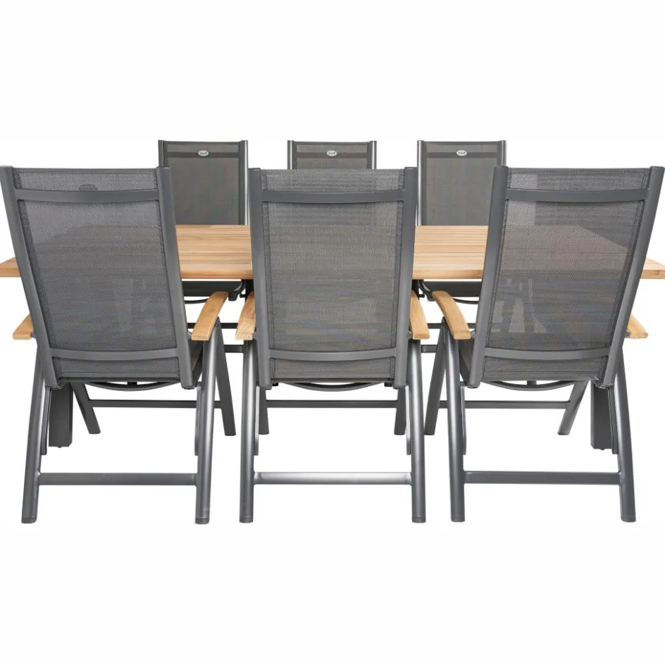 De Taste by 4 Seasons Ambassador 240 x 100 cm Troy 6 tuinset bestaat uit een robuuste tafel met een teakhouten tafelblad. Dit warme teakhout is van zeer hoge kwaliteit en hierdoor kan het geen kwaad om de tafel het hele jaar buiten te laten staan. Een opvallend detail is dat de planken van het tafelblad verschillende breedtematen hebben, wat zorgt voor een originele en eigentijdse look. Daarnaast bevat deze set 4 verstelbare tuinstoelen die gemaakt zijn van aluminium en hierdoor licht van gewicht en onderhoudsarm zijn. De armleuningen zijn gemaakt van teakhout wat voor een unieke twist zorgt.