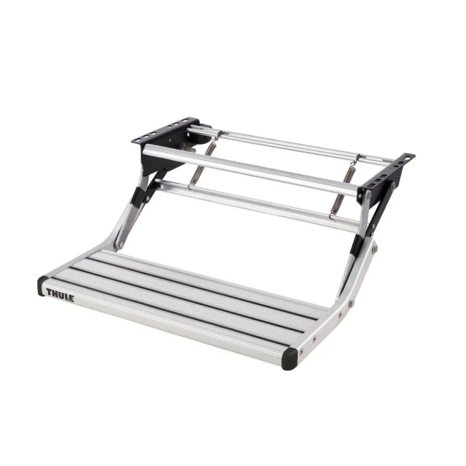 Bij deze opstaptrede zijn ook de zijkanten uitgevoerd in geanodiseerd aluminium. De scharnierende onderdelen rusten in onderhoudsvrije lagers zodat smeren overbodig is. De Single Step 12 volt heeft dubbele scharen, aan beide zijden van de treden, voor extra stabiliteit. Deze opstaptreden worden bij Thule continue getest en de door hen gestelde eisen overschrijden zelfs de Europese EN1646 norm! Daarom kan de Single Step een maximale statische belasting van 200 kg dragen.