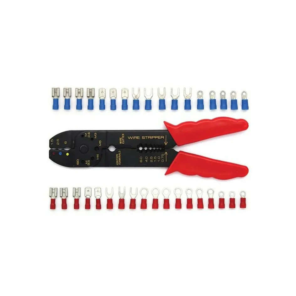 Dit pakket bevat naast een krimptang tevens 80 stuks kabelschoenen. De kabelschoentjes zijn rood en blauw van kleur en hebben een divers assortiment. Praktisch is dat de krimptang voorbedrukt is met eenheden en maten.